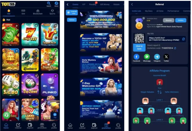 It features a myriad of games, including Teen Patti, Rummy, slots, live casino, arcade, and cricket betting. What makes the TOT 55 game unique is its strong focus on the Pakistani market, allowing easy deposits, fast withdrawals, and regional events.